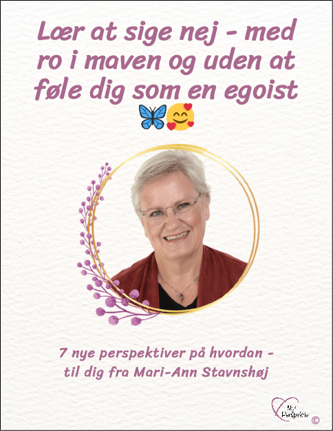 Så få nye vinkler til, hvordan du kan ændre det i min e-guide "Lær at sige nej - med ro i maven og uden at føle dig som en egoist" - 7 nye perspektiver på hvordan.